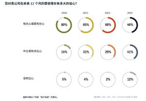 在参与调研的 CEO 中,只有不到一半的人表示:他们对 2023 年的营收增长感到“有信心”或“很有信心”。这与 2021 年有很大不同,当时随着新冠疫情的消退,近 70% 的人表示有信心看到来年的营收增长。新冠疫情前进行的 2020 年调研结果则呈现出最为强烈的乐观情绪。
