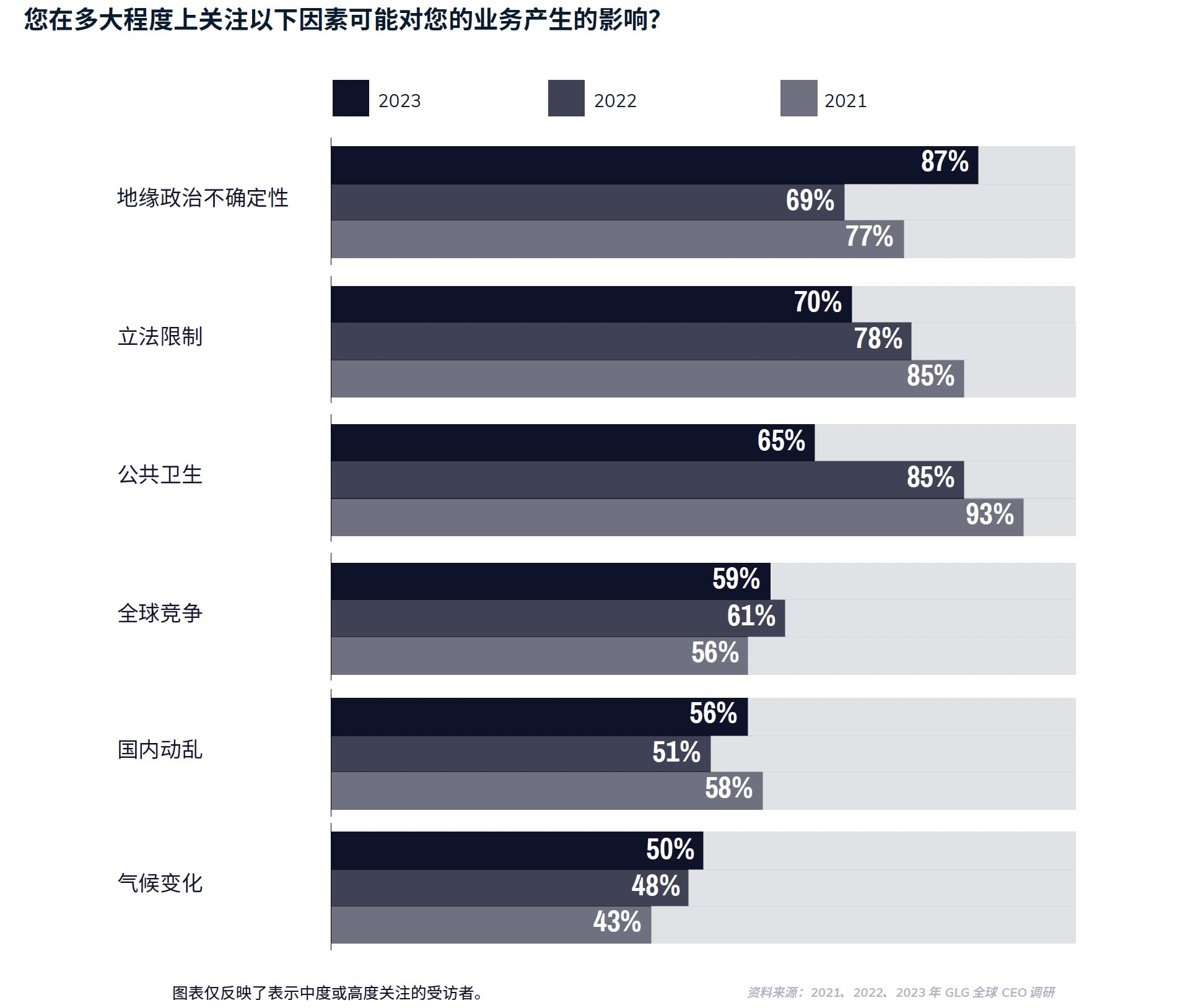 然而,是什么因素动摇了 CEO 们的信心呢?在新冠疫情时期的调研(2021、2022 年)中,受访者将“公共卫生”列为预计会影响其业务的首要因素。今年,“地缘政治不确定性”的问题最受关注。俄乌战争及其在全球的连锁效应无疑是一部分原因。