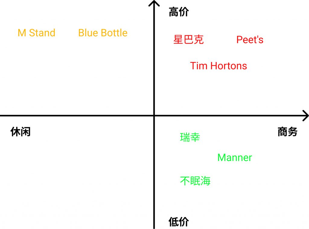 “商务高价”:四个象限中最值得做的第一象限。因为既有最优质的客户、最高的消费频次,又能尽可能地满足每一杯的高毛利率。这个象限竞争激烈,需要很谨慎,目前这个象限中的主打品牌有星巴克、Tim Hortons 和 Peet’s。