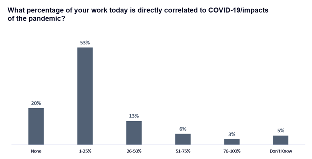 Although COVID-19 still dominates our lives, it would appear many consulting clients are looking beyond the pandemic itself. Most of our survey respondents had at least a small amount of their current work related to COVID-19 or its impacts. But of the three-quarters of respondents who had some work related to the pandemic, 53% said it accounted for less than a quarter of their current work.