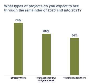 GLG received an array of responses for the type of work our consultant population was expecting to engage with in 2021. The top three projects were strategy work (76% of respondents), transactional due diligence work (60%), and transformation work (54%). (Note: respondents could select multiple responses.)