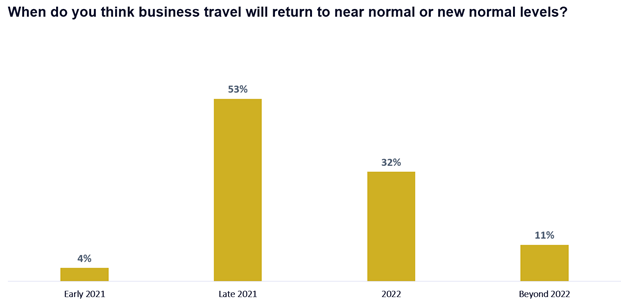 Corporate travel has suffered deeply due to the pandemic. According to research cited by GLG network member Peter McFadden, former Head of Strategic Partnerships at Expedia Group, tickets issued by corporate travel management companies were down 85.7% year over year from 2019. The majority of consultants, 53%, told GLG they expected to remain grounded until at least late 2021, with 43% not expecting to reach new normal levels until 2022 or later. Only 4% of respondents expected a quick return to “new normal” business travel next year.