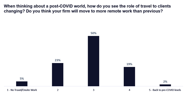 The pandemic is likely to permanently change how consultants interact with clients. Our respondents said they expect to move away from always being on-site with a client to more of a hybrid approach. Over a quarter of the surveyed consultants said they felt that post-COVID, there would be little to no on-site client work. Half said it would be more of an even balance between on-site and remote work. Only 2% said their company would get back to pre-COVID levels of in-person client work.