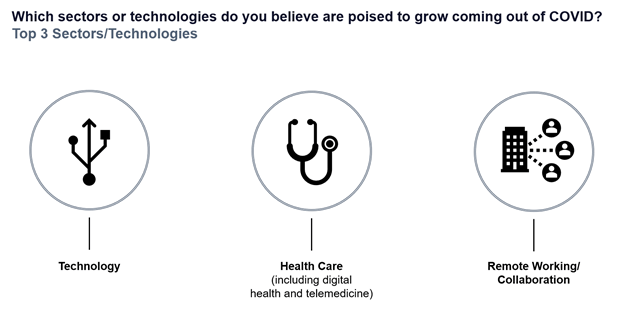 The consultants we surveyed said they believe some industries are poised to grow following the pandemic. Not surprisingly, given the role it played in 2020, the tech sector and some specific technologies are at the top of most respondents’ lists. When asked to name up to three sectors or technologies poised to grow, their top answers were technology as a sector, remote working and collaboration tools, software as a service, and healthcare, including telemedicine and digital health.