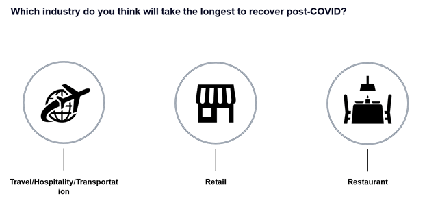 When asked which sector would take the longest to rebound, 61% of respondents named travel/hospitality/transportation. Given their earlier responses about business travel, this is not surprising. Fortunately, no other industries came close to receiving many responses, with the next closest being the retail sector at only 9%.