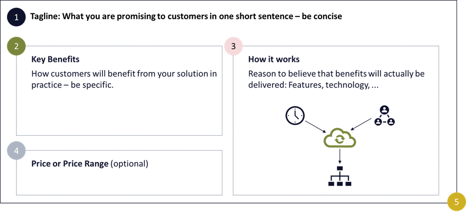 - The benefits your solution offers customers are the next essential element of your concept: be specific. Whereas your tagline is a short, high-level introduction, your benefits need to be particular. How will your solution improve customers’ business, their performance, or work process? What will they gain if they adopt your product? Keep in mind that benefits are not features. They describe the added value the product creates for the customer, not attributes of the product itself.