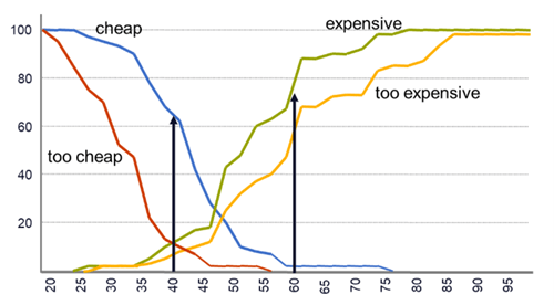 The first method, Van Westendorp’s Price Sensitivity Measurement, does not directly ask about the accepted price. It identifies critical price thresholds. Respondents divide a spectrum of prices into critical areas. In a survey, we would introduce a product or service concept and ask these questions: At what price would you say that this product is cheap, so that you would doubt the quality? Or too expensive, so that you would no longer buy it? These insights into customer price sensitivity to a new idea are often good enough in early innovation. This early insight can help to align product development and pricing from the beginning.