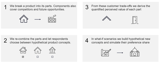 So how does it work? We break a product into parts, like a house made of Legos. In a conjoint survey, respondents would not assess bricks, roofs, or doors, they would choose among houses. From these choices, we can derive the perceived value of bricks, roofs, and doors. These perceived values can then create “what if” scenarios and build hypothetical new concepts and products and simulate that preference share among customers.