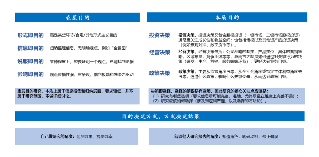 上述四种“非本质目的”的研究,虽然也有自身存在的理由,但却并非我们所探讨的重点,其技巧性与聚焦于“本质目的”的研究完全不同,通常也不能被用作决策。因此,我们重点讨论的是基于决策目的的行业研究——包括投资决策、经营决策、政策决策。 这三者中,我们会花较多的精力和篇幅去探讨以“投资决策”为目的的研究方法,通常重点需要回答的问题是“是什么?”以及“为什么?”而不太涉及到“怎么办?”,而以“经营决策”和“政策决策”为目的的行业研究需要回答“怎么办?”的问题,涉及到的问题往往会更复杂一些。
