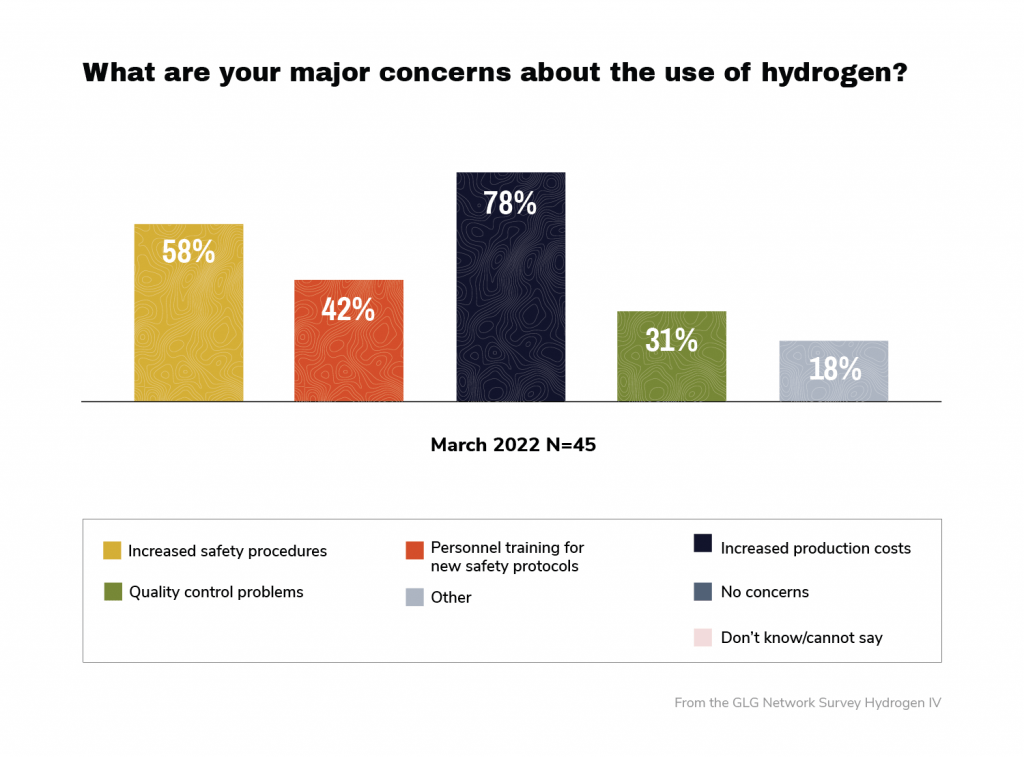 When we asked them to rank their top concerns about hydrogen production, our panel indicated that increased production costs were a top concern (78%), followed by increased safety procedures (58%) and personnel training for new safety protocols (42%).