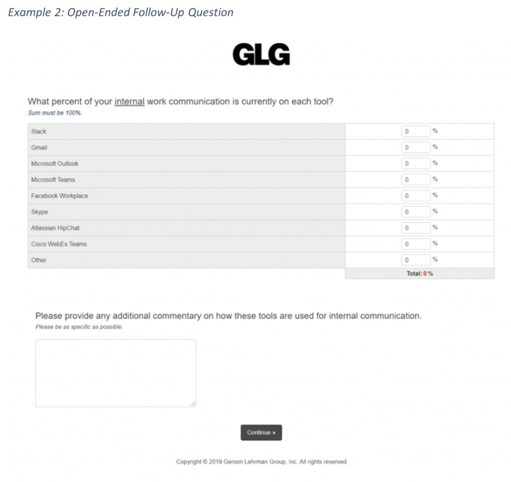 Pros: The follow-up is a great way to dig deeper on a respondent’s answer. It also provides less opportunity for responses to wander off topic since participants are responding to an answer they’ve already given and that they can still see on the screen.