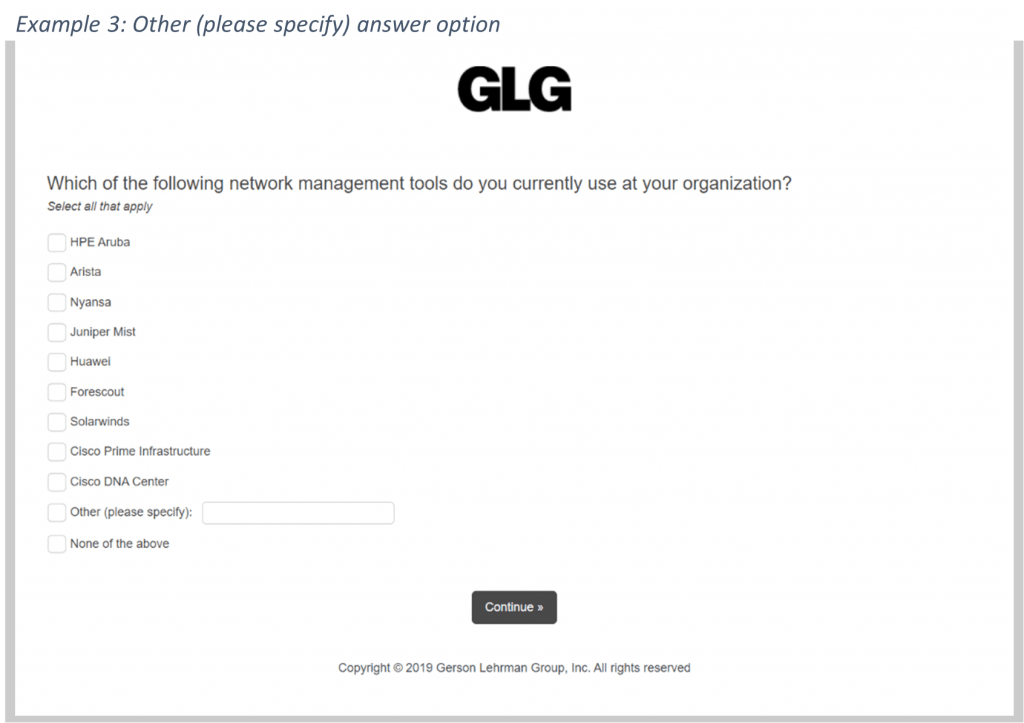 - Overreliance — Open-ended questions are taxing for respondents to answer. Asking too many will lead to higher rates of dropout or less thoughtful responses. If responses can be predicted or captured in near entirety, then do so by using “Other (please specify).” Save the respondent the trouble.
