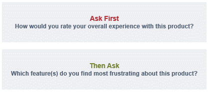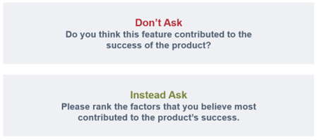 If you were to ask the second question first, respondents would be primed to think negatively about the product. They may actually like the product, but they’ve just thought about all the things they don’t like about it. When asked about their overall view after that, they’ll probably rate the product lower than they truly perceive it.