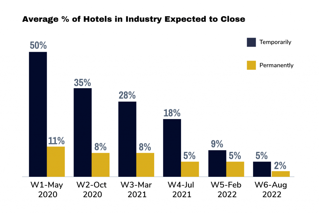 In the early days of the pandemic, you couldn’t blame hoteliers for being pessimistic. May 2020 saw our respondents at their nadir. Half of those we surveyed shared that they expected to close the doors temporarily, and 11% saw their sites shuttering forever. This clearly eased over time. In our most recent survey, only 7% foresaw closures of any kind.