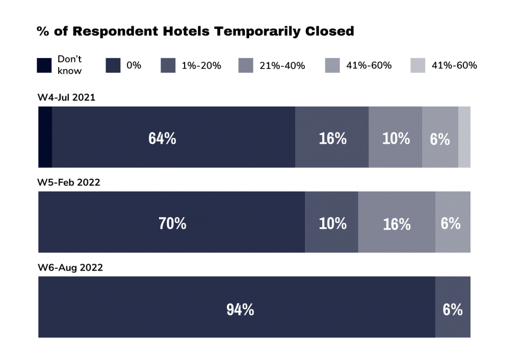 Similarly, when we asked our panel in August 2022 about hotels that were actively closed, they told us that none of their sites are currently closed, a significant change even over our respondents’ answers in our survey of February 2022.