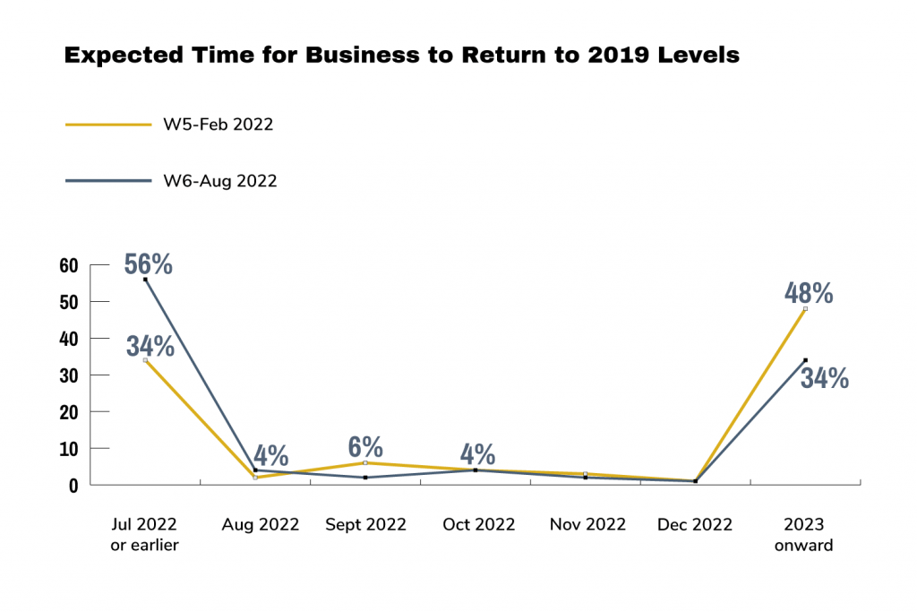 As far as returning to pre-pandemic levels, our respondents are still divided. In our August survey, slightly more than half believed that business had already returned to 2019 levels. Except for a few opinions scattered across the calendar, the rest (34%) didn’t feel they’d reach pre-COVID levels of business until at least 2023.