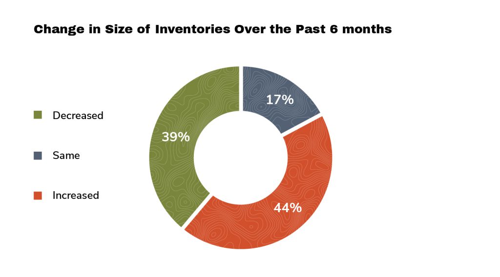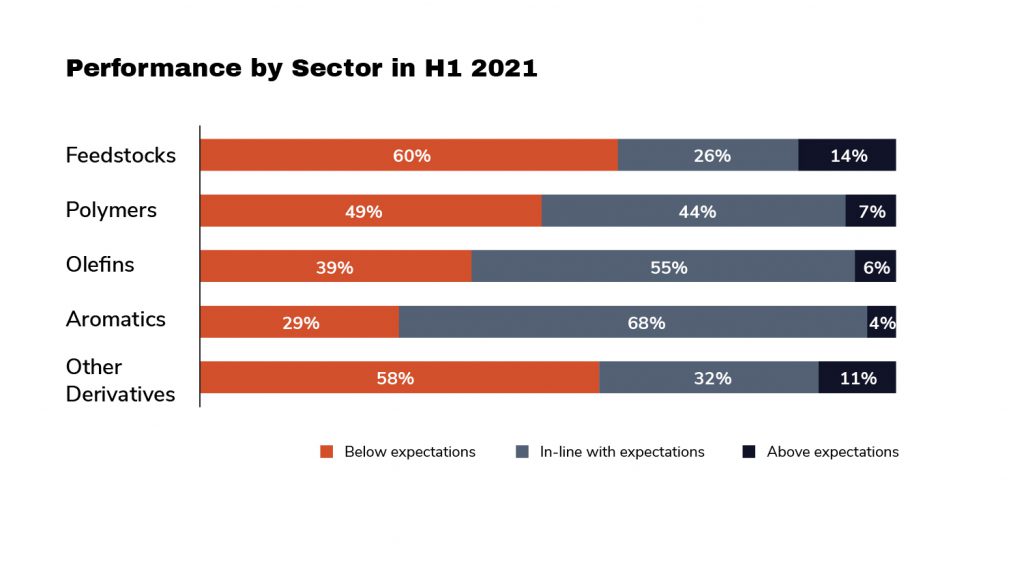 GLG’s survey revealed considerable variation in terms of H1 performance. In the important olefins area, for example, 55% of the respondents reported that H1 2021 performance had been in line with expectations, while 39% saw it as below expectations. A similar divergence was seen upstream: 68% of aromatics respondents saw performance in line with expectations, whereas 60% of feedstocks respondents saw it below expectations. In polymers, the sector closest to end users, 49% saw performance above expectations and 44% saw it below. Perhaps surprisingly in view of the media focus on supply chain problems, 39% said their inventories had increased in H1, twice as many as reported a decrease.