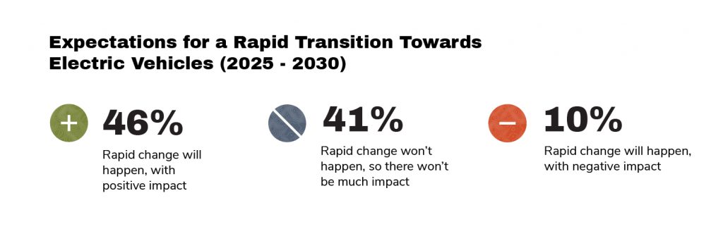 This divergence of views is highlighted in attitudes to the potential for a rapid transition to electric vehicles in the auto sector. Forty-six percent see this as likely to create rapid and positive change, while 41% see little likelihood of this happening — and 10% expect rapid change with a negative outcome for their business.