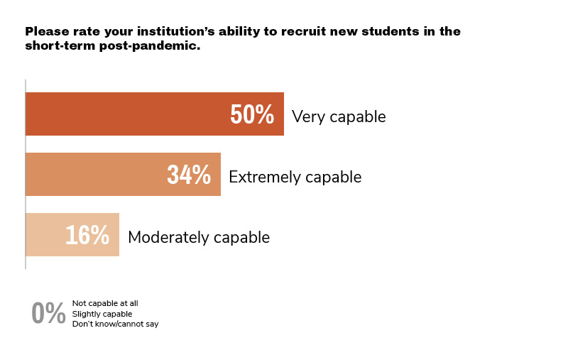 Faculty and management of private institutions see the pandemic impact to be short term and are optimistic about the resumed volumes of post-pandemic education delivery. The disruption caused educators to focus more on student communication as well as an increase in student care and innovation. All our respondents express some level of confidence in their institution’s ability to recruit new students post-pandemic, with a whopping 84% rating their capability at either “very capable” or “extremely capable.”