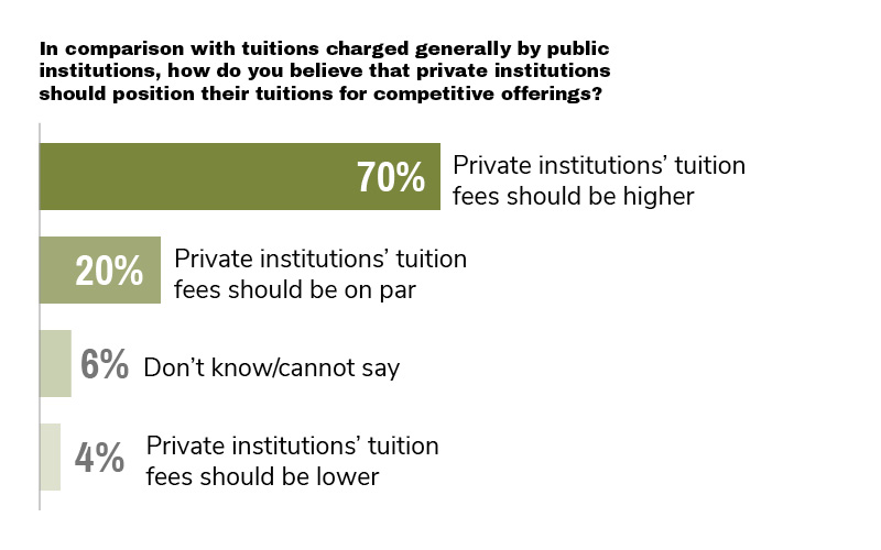 Faculty and management of private institutions understand the need to be mindful of tuition in comparison with their competitors, including public institutions, given their lack of publicly supported funding subsidies. Our survey shows that 90% of respondents believe that in comparison with the tuitions charged generally by public institutions, the tuitions at private institutions should be at par (20%) or higher (70%).