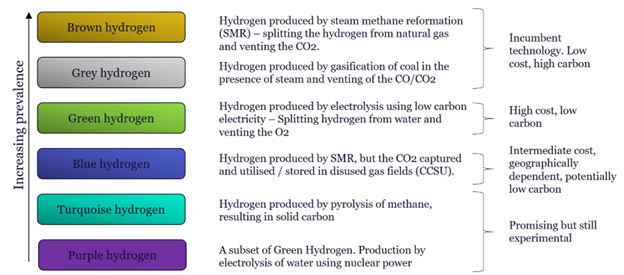 Purple hydrogen is a subset of green. With purple, you’re splitting off hydrogen from water, but electricity comes from nuclear power rather than a renewable source, such as wind.