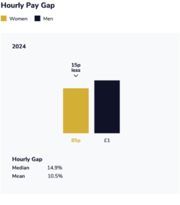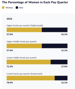 Over the last two years, we have seen an increase in our hiring of women across the organization. To contextualize our data, it’s important to note that we tend to hire at more junior levels, and then promote from within, which has resulted in women making up a greater percentage of our Lower and Lower Middle Quartile pay groups (78.9% and 72.4% in 2024, respectively). This, consequently, impacts our median pay gap (the comparison of pay and bonus earnings for the middle female and male employee when put in ascending order).